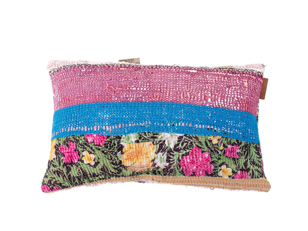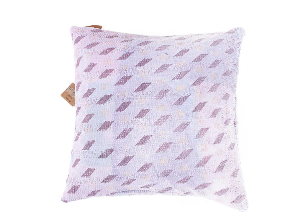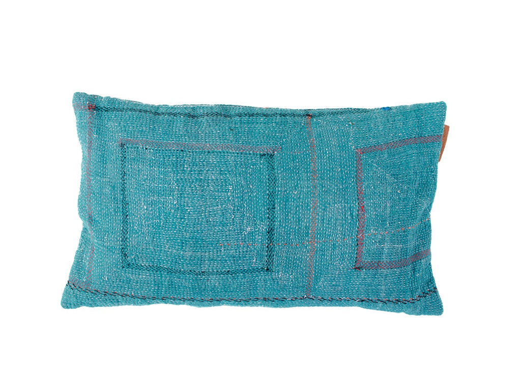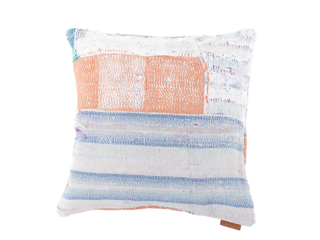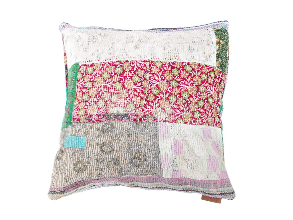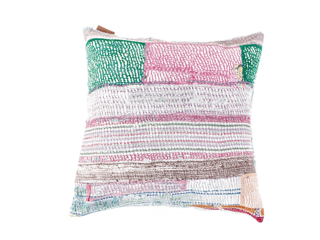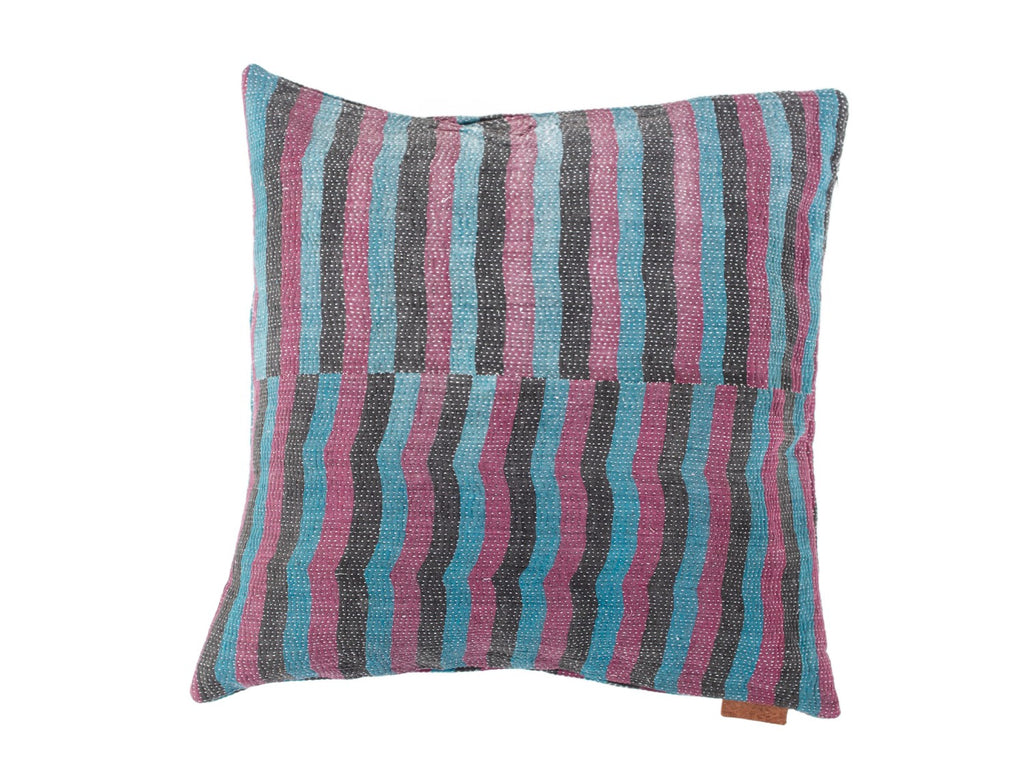 Fine Q are Sari cushions produced from a type of sari that has a different expression than our normal Sari Kantha cushions. They are made of thick recycled cotton sari laid together with several layers in between and with a worn look, where the saris inside help to give the whole pillow a very raw vintage look. They are toned down in colors and patterns and are sewn with smaller and tighter Kantha stitches, which give them an authentic look..
